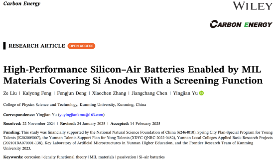 近日,物理科学与技术学院材料物理方向于英健课题组在中科院一区TOP期刊《Carbon Energy》(IF=24.2)上发表题为《High‐Performance Silicon–Air Batteries E...