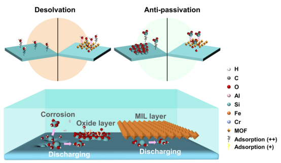 硅-空气电池因其高理论能量密度和安全性优势而备受关注。然而,硅-空气电池的实际能量密度仍显著低于理论值,主要由于硅阳极的腐蚀问题与钝化。本研究采用多种金属-有机骨架(MOF)材料,如MIL-53(Al),MIL-88(Fe)和MIL-101(Cr)对硅负极进行改性。这些金属有机骨架材料被制备成不同形貌和粒径,通过改变其核心金属节点和配体来调节孔径大小。该方法旨在调控H2O、SiO2和OH−的吸附行为,从而减轻腐蚀和钝化反应。在150微安恒定电流下,采用MIL-53(Al)@Si、MIL-88(Fe)@Si和MIL-101(Cr)@Si作为阳极的硅空气电池,其使用寿命分别为293小时、412小时和336小时,分别超越了原始硅负极所观测到的276小时。在这些复合阳极中,MIL-88(Fe)@Si由于其优异的疏水性和最佳孔径,显著促进了OH−迁移,从而展现出最佳性能。