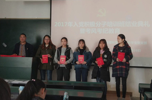 12月26日,物理科学与技术系学生党支部举行2017年入党积极分子培训班结业典礼,同时对党员和入党积极分子开展期末考风考纪教育。全体支部党员和所有入党积极分子参加典礼。