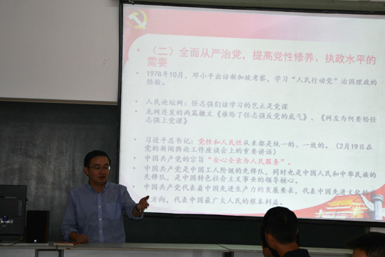 5月27日,物理科学与技术系学生党支部在惟真楼1113教室开展“两学一做”学习教育专题党课。党总支副书记王宁以“与时俱进学党章”为主题,给全体学生党员讲了一堂深刻的党课。